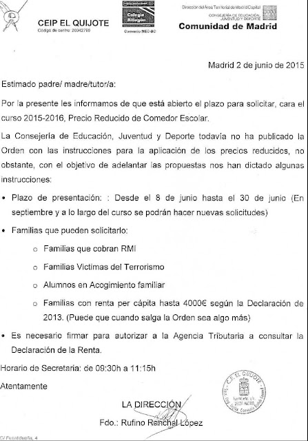 Además les informamos de que se ha abierto el plazo para solicitar precio reducido de comedor escolar para el próximo curso 2015-2016. El plazo de presentación es del 8 de junio hasta el 30 de junio. Para más información, les facilitamos la circular :
